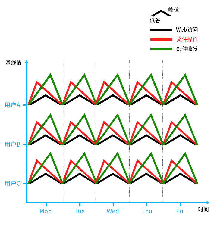 △ 本图展示了3个用户的个体行为基线,包括邮件收发、文件操作和web访问三个业务操作场景。将用户行为进行纵向分析计算,可得到部门行为基线。