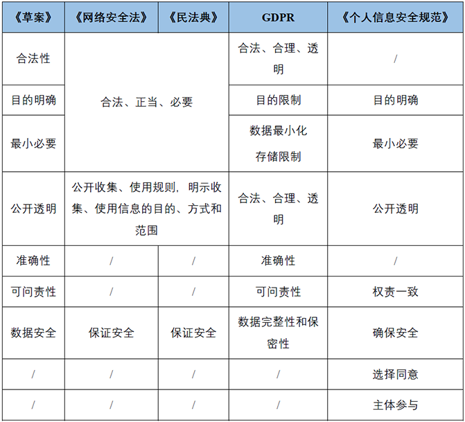 此次发布的《草案》规定了个人信息处理的七大基本原则,分别是合法性原则(第五条)、目的明确原则(第六条)、最小必要原则(第六条)、公开透明原则(第七条)、准确性原则(第八条)、可问责性原则(第九条)、数据安全原则(第九条)。这七大原则与既往的相关法律法规一脉相承,又有新的突破。