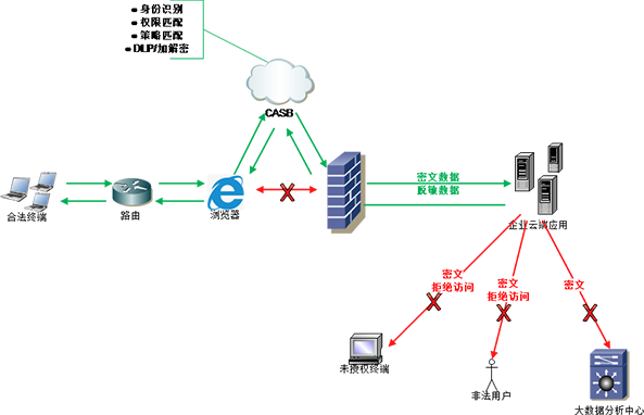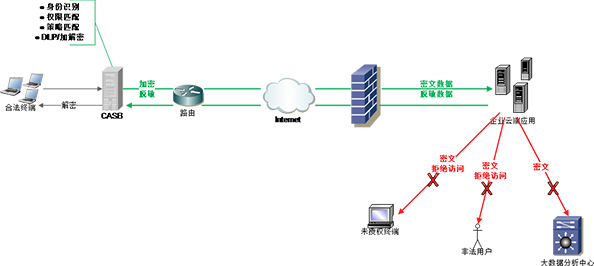 用户在使用云服务或云应用的过程中,其数据必然会进入服务商的系统中,随着出现了用户与服务商之间的信任问题。尤其是具备高度隐私属性的数据,云存储会带来极高的风险,如金融业、医疗业等。类似行业的数据隐私属性极高,如果直接上云会带来极大的泄漏风险,因此需要使用云访问安全代理(CASB)来帮助实现规范云上数据的合规性和安全性。