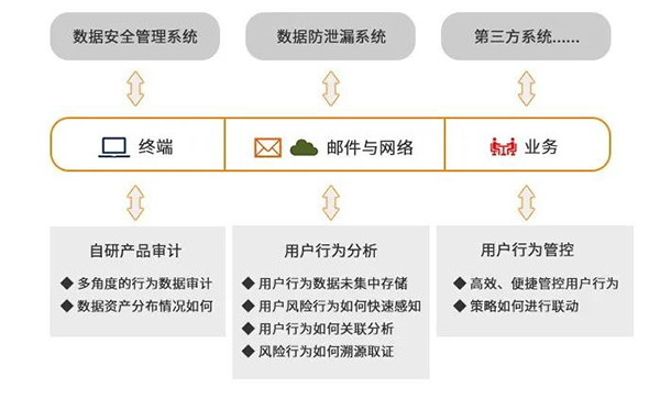 对数据安全产品与业务系统及安全设备进行数据采集、数据分析、数据展示与资产统计等,通过多环节、多角度的关联分析手段,解决内部威胁。