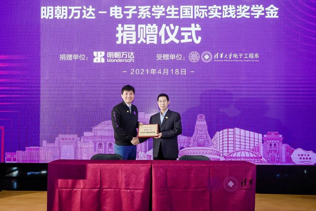 4月18日,明朝万达-清华大学“电子系学生国际实践奖学金”捐赠仪式在清华大学举行。