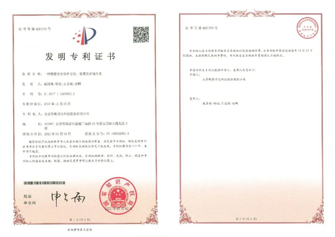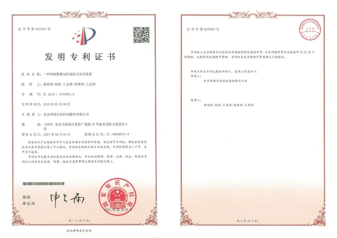 作为中国新一代信息安全技术企业的代表厂商,明朝万达始终坚持将技术创新作为企业发展的核心推动力,打造了一支由清华大学博士和硕士为骨干力量的研发团队,支撑起公司强大的自主知识产权体系与核心竞争力。截止目前,公司已申请发明专利300余项,授权专利近140项。