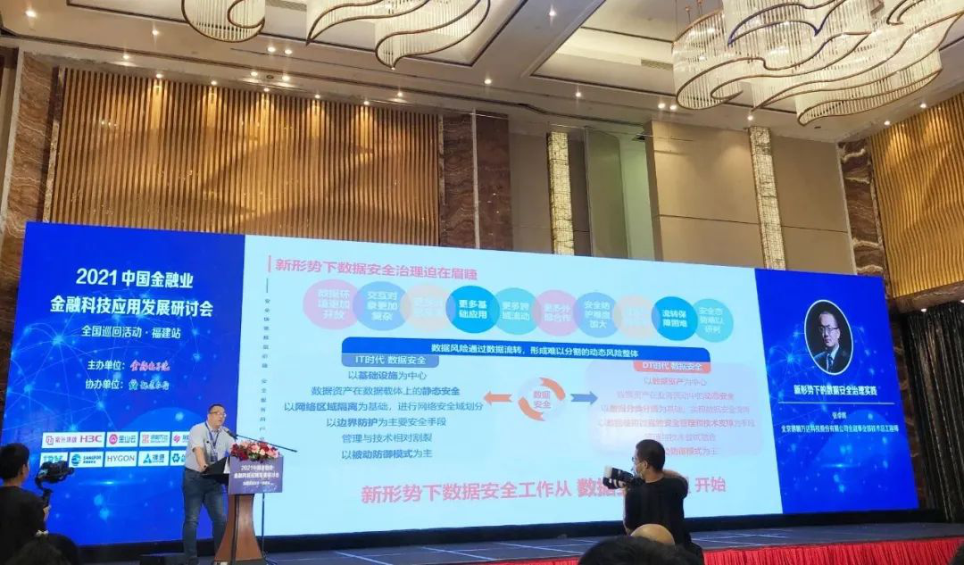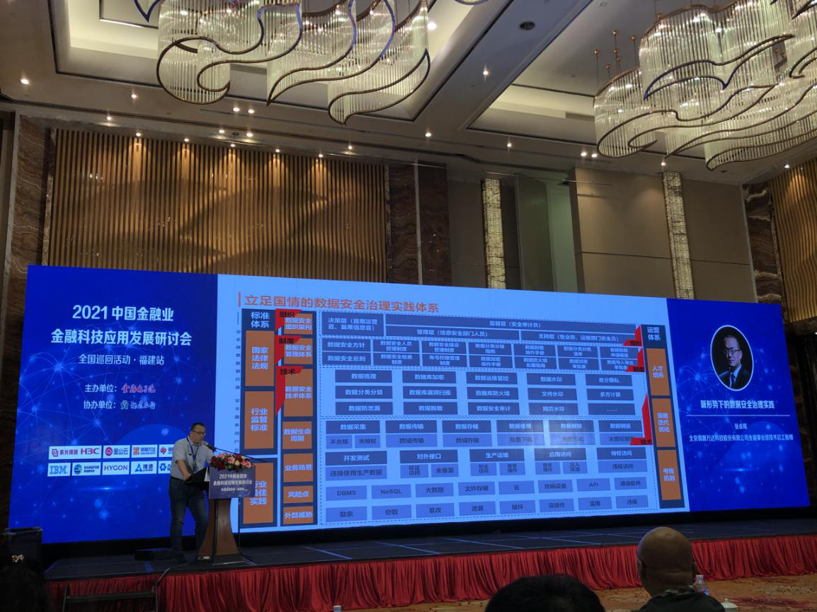 6月9日,由中国金融电子化公司主办,福建省农村信用社联合社协办,以“金融科技赋能‘数字福建’高质量发展”为主题的“2021中国金融业金融科技应用发展研讨会全国巡回活动·福建站”在福州市正式召开。北京明朝万达科技股份有限公司(以下简称“明朝万达”)金融事业部技术总工程师张卓晖受邀出席会议并以“新形势下的数据安全治理实践”为题,和与会的领导、专家、业界精英们分享了明朝万达数据安全治理实践体系建设经验。