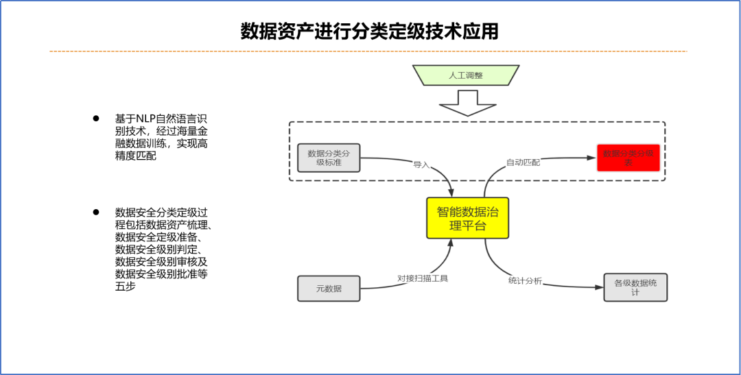 在数据爆炸的时代,数据安全治理已经不能仅仅依靠人工的方式,运用最原始的技术进行。以人工方式,辅助技术手段进行数据安全治理,明朝万达有智能数据治理平台基于NLP自然语言识别技术,经过训练学习,实现高精度的分类分级匹配。