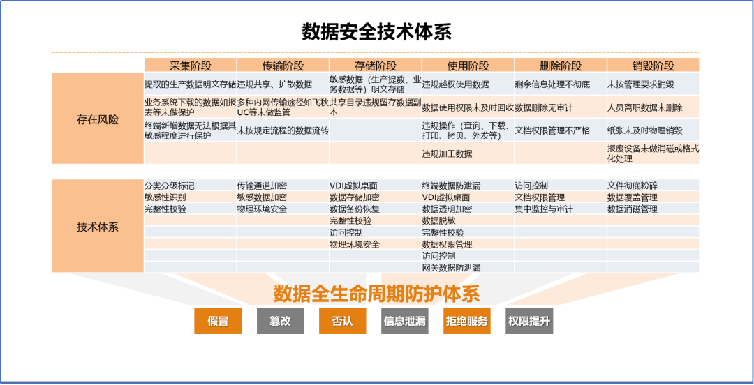 高度对标《数据安全法》,按照数据的采集、传输、存储、使用、删除、销毁全生命周期分析存在风险,针对性的应用技术方式,辅助形成管理制度和数据安全命周期安全管理流程。