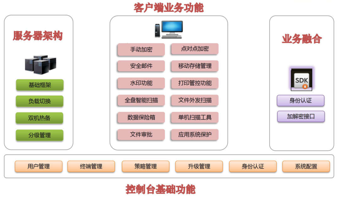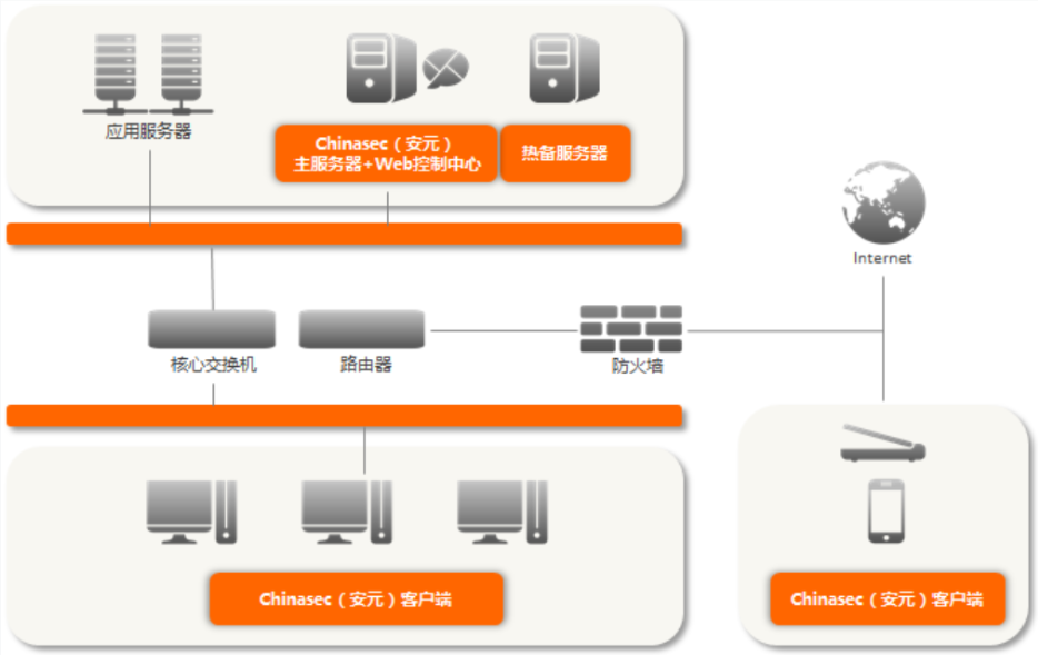 Chinasec(安元)数据安全管理系统包括:终端数据防泄漏、网络数据防泄漏、数据安全交换、安全集中监控与审计、文档加密、应用保护、安全邮件、移动存储介质管理、虚拟安全桌面。
