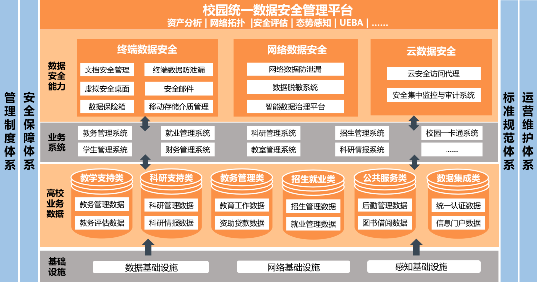 随着大数据、云计算、移动互联网、物联网等新一代信息技术的快速发展和应用,各地高校大力发展建设数字校园、智慧校园,相关信息化应用日益丰富。据《2020年网络安全态势洞察报告》数据显示,教育行业泄漏事件占比高达53%,其中以高校居多,占比65.36%。2021年3月,教育部发布《高等学校数字校园建设规范(试行)》,提出“数字校园相关系统产生的数据量大,且关系到师生的隐私,因此针对数字校园相关系统产生的数据应具备保护措施。”