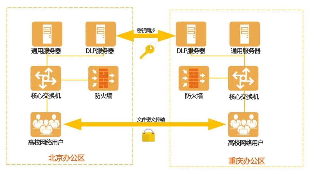 某高校研究所分布在北京、重庆两地,工作人员日常办公采用内外网模式,办公内网已成为其开展工作不可或缺的重要组成部分,存储有大量的内部文件以及科研成果,根据研究所的安全管理要求,需要对两地内网环境中的敏感数据进行防护,防止数据泄漏事件的发生。针对该研究所当前现状分析其面临的安全风险,明朝万达提出了一套有效的数据防泄漏安全解决方案。