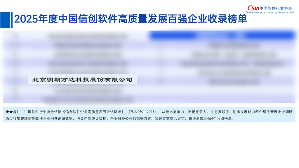 近日,中国软件行业协会(CSIA)首次发布《2025 中国信创软件高质量发展报告》,同步揭晓 “2025 年度中国信创软件高质量发展百强企业” 榜单。明朝万达凭借在信息安全领域的技术积累、市场表现与生态贡献,成功入选该榜单 “信息安全类企业” ,这是行业对明朝万达信创安全综合实力的又一权威认可。