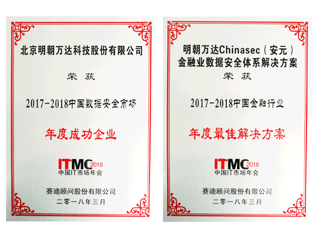 本次大会上,明朝万达凭借精专的产品、优质的服务,以及丰厚的实践经验,再次获评了 “2017-2018中国数据安全市场年度成功企业”奖项,同时,Chinasec(安元)金融业数据安全体系解决方案,荣获了“2017-2018中国金融行业年度最佳解决方案”。通过多年来在金融行业的不断深耕,明朝万达将技术深入并融合至业务,量身定制多种解决方案,以最大化满足客户的需求。目前,已广泛应用至交通银行、光大银行、中信银行、中国银行等数十家金融机构。