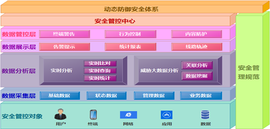 要实现数据的管理,除了具备动态安全思想之外,还需要集中管控的建设能力。动态防御体系在实现过程中,会出现应用系统繁多、数据类别繁杂、请求操作过多等问题,如此复杂的业务内容如何才能进行针对性的动态防护?此时,就需要集中管控。集中管控的过程是:采集不同对象在不同环境中的行为过程,分析整个过程中的数据信息,继而找到异常行为,并实时动态的展示给管理者,最终根据危害的程度进行不同量级的管控手段。整个过程中由信息采集、信息分析、事件展示、管理决策四个单元构成。其中,信息采集是基础,负责收集全网中的各种的信息;信息分析是核心,通过引入计算模型,对收集到的基础信息进行分析和展示;事件展示是能力,为管理者提供一种简单、有效、准确的决策依据;管理决策是手段,一旦发现安全违规事件,则通过各种管理和技术手段进行控制。