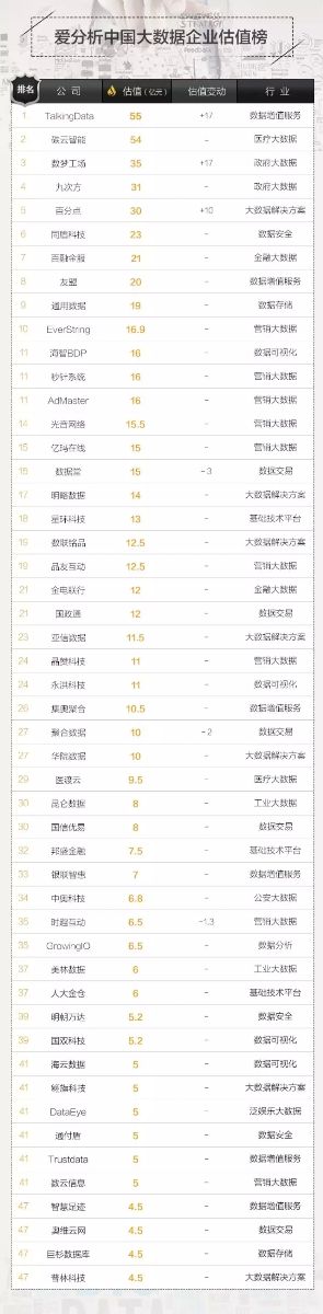 爱分析是一家专注于创新企业研究和评价的互联网投研平台,历经2个月,实地调研了20多家大数据创新公司,以及国外对标公司,如Palantir、Tableau等,基于行业趋势判断、公司业务分析等层面,制作如下“中国大数据企业估值排行榜”,以树立大数据行业标杆。