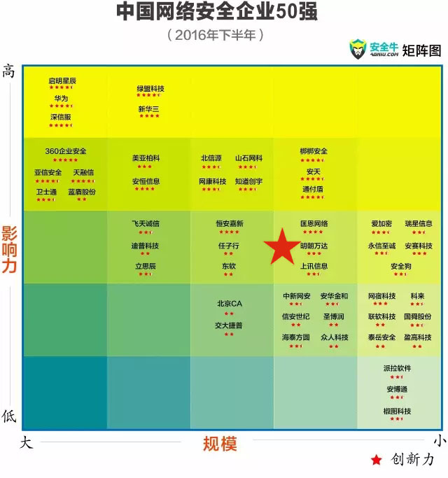 1月3日,安全牛发布《中国网络安全企业50强》(2016年下)。本次调查从500家安全企业中挑选出的200家候选企业,调查数据基于2016年上半年的各项数据和企业信息。国内数据安全领军企业——明朝万达(证券代码:835348)再次入围。