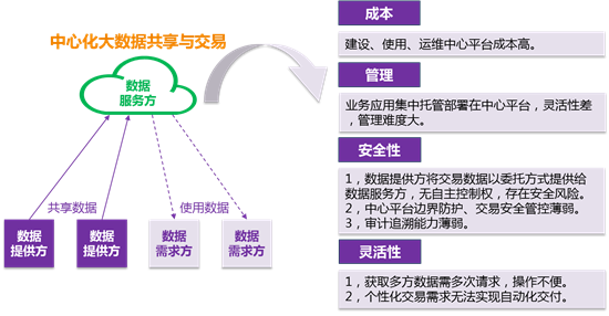 国内大数据交易处于初期阶段,部分大数据交易平台制定了大数据交易规则,对交易平台、交易主体、交易对象进行规范,属于探索性质。针对大数据交易共性敏感问题,缺乏全面、权威、有公信力的解决方案。在中心化系统结构下,大数据交易存在成本、管理、安全性、灵活性等方面的问题难以突破,对大数据安全共享与交易形成了挑战。