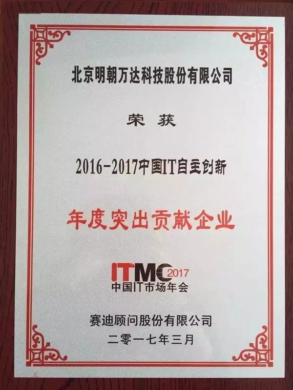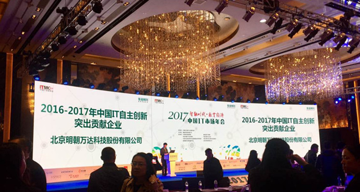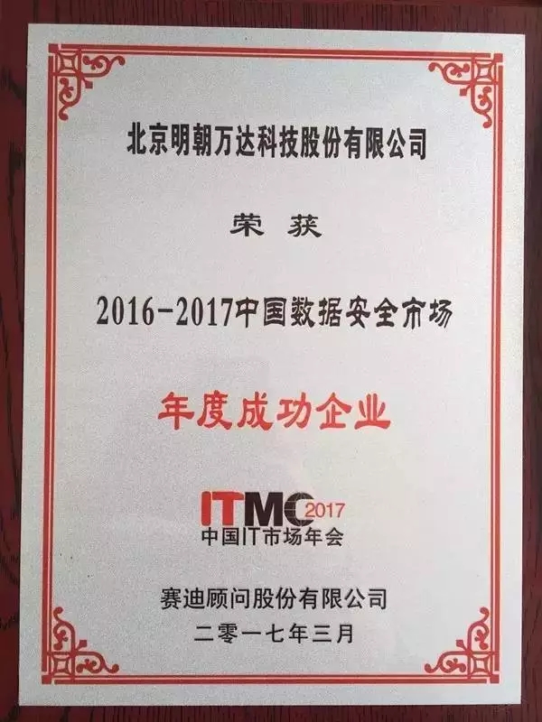 3月16日,由中国电子信息产业发展研究院指导、赛迪公司主办的以“智能时代•数字经济”为主题的2017中国IT市场年会圆满落下帷幕。明朝万达作为新一代信息安全代表企业备受业界关注,同时斩获了“2016-2017中国IT自主创新-年度突出贡献奖”和“2016-2017年中国数据安全市场-年度成功企业”两项殊荣。