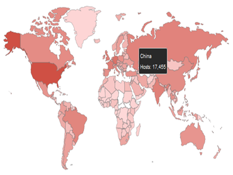 Elasticsearch被广泛应用于数据存储。2017年1月17日据国内威胁情报预警机构对68000余个Elasticsearch进行统计分析,发现目前全球共有9750台存在勒索信息。其中此次被删除的数据达到至少500亿条,被删除数据大小至少450TB。通过对比分析,发现有大概1%的Elasticsearch使用了身份验证插件,另外有2%则关闭Elasticsearch,现在已经无法访问。目前全球中受影响最多的为美国4380台,其次是中国第二944台。法国787台,爱尔兰462台,新加坡418台。