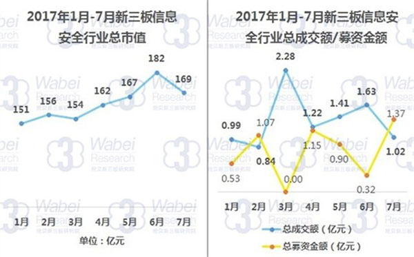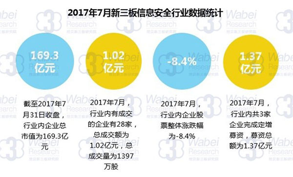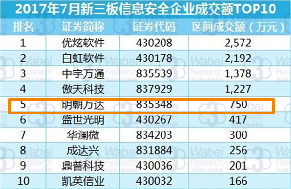 近日,挖贝新三板研究院发布2017年7月新三板信息安全数据报告(以下简称报告),该报告统计了新三板市场的91家信息安全企业的市值、成交额、股票整体涨跌幅度及定增募捐等情况,并整理出前10名的排行。明朝万达市场估值排名第三,总成交额排名第五。