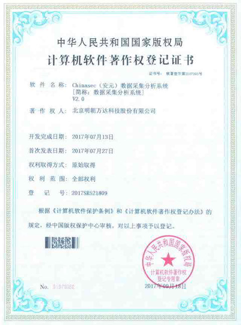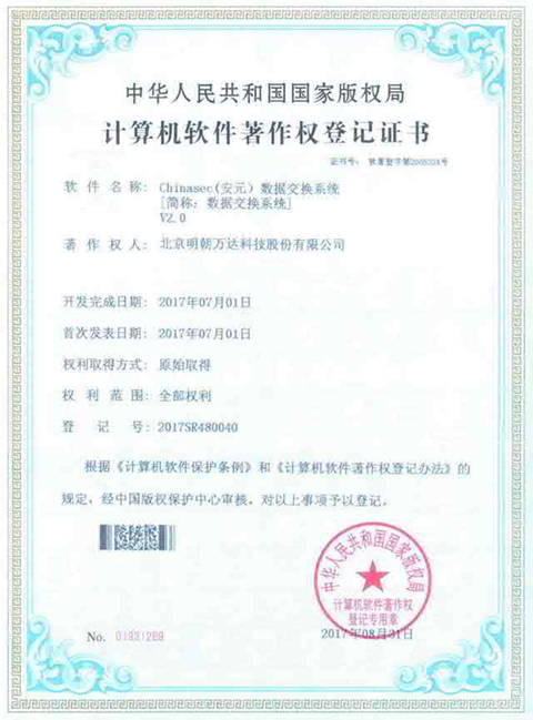 2017年9月,明朝万达自主研发的“Chinasec(安元)数据交换系统 V2.0”、“Chinasec(安元)数据采集分析系统 V2.0”两项产品顺利通过了国家版权局中国版权保护中心的严格审查,正式获得了由国家版权局核发的《计算机软件著作权登记证书》。至此,明朝万达已拥有软著证书54项。