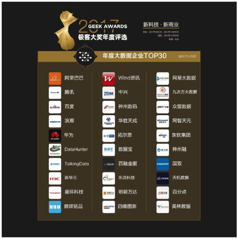 2017极客大奖(Geek Awards2017)“年度大数据企业”评选活动,集20万专业读者、500名自明星(自媒体)作家、专家评委及极客网编辑团队之力,最终评选出了2017年度大数据企业TOP30,这些企业在一定程度上代表了2017年中国大数据市场的主要势力。