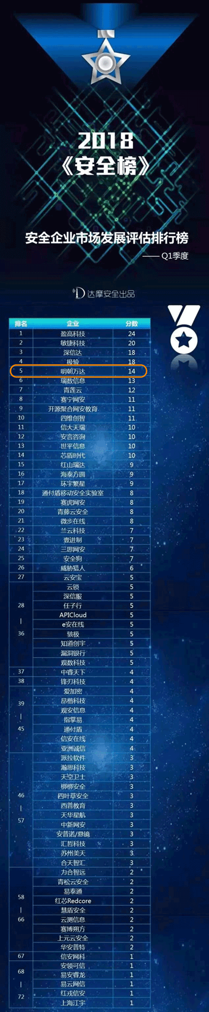 4月9日,达摩安全发布2018年《全国安全厂商Q1季度市场发展评估排行榜》,明朝万达凭借技术与业务的深度融合,以及在安全行业取得的优异成绩和极高的市场占有率,强势入围榜单。