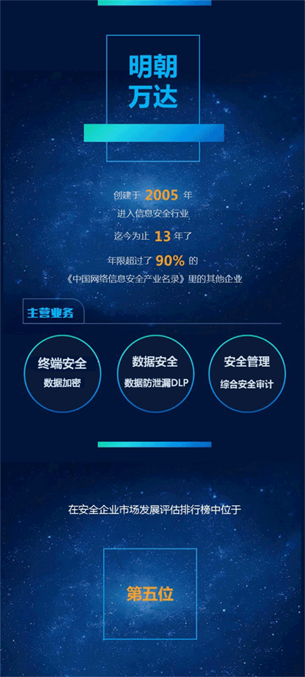 明朝万达作为中国新一代信息安全技术企业的代表厂商,专注于数据安全、公共安全、云安全、大数据安全及加密应用技术解决方案等服务。凭借具有自主知识产权的优势技术、专业完善的产品及解决方案、业务领域深耕数年的丰富经验和高品质的服务,获得了市场及用户的好评,在业内树立了良好的品牌形象。