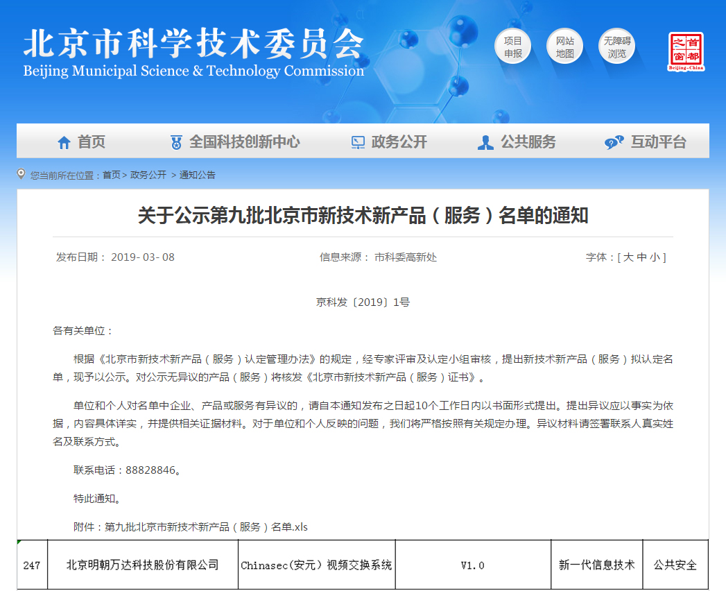 近日,由北京市科学技术委员会等六家单位联合发布了“第九批北京市新技术新产品(服务)”认证名单公示。明朝万达自主研发的Chinasec(安元)视频交换系统成功入选。