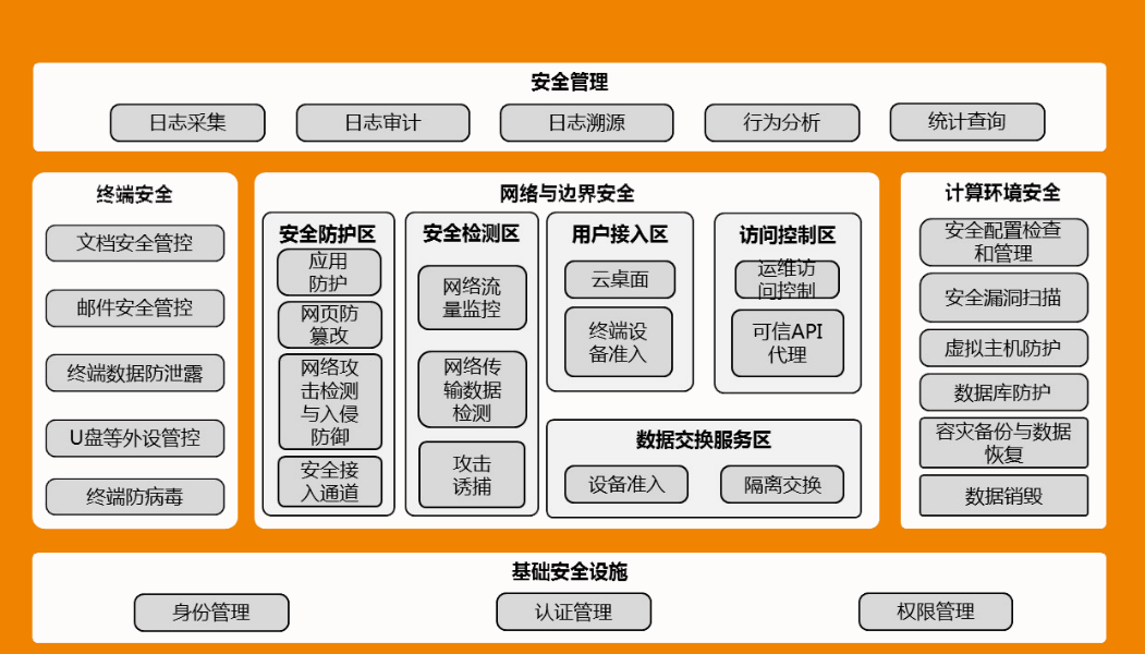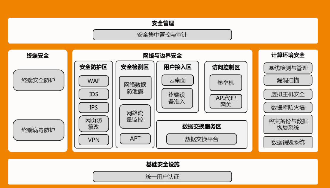 最后,以终端安全、网络及边界安全、计算环境安全构成由外到内多级专网纵深防御能力。通过终端安全系统与终端病毒防护系统,保障用户操作终端始终处于安全、可控、可信状态;通过将网络划分为安全边界防护区、安全检测区、内部用户接入区、运维用户接入区、数据交换接入区、数据交换区、应用控制区、访问控制区,并根据内部用户、运维用户、数据交换等不同应用场景,细化安全纵深管控粒度与管控层级,形成了多层次纵深防御能力;通过针对主机服务器等计算环境基础设施的基线管理、漏扫、数据库防护与容灾备份,形成针对最内层计算环境的安全防护。