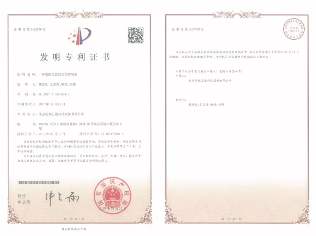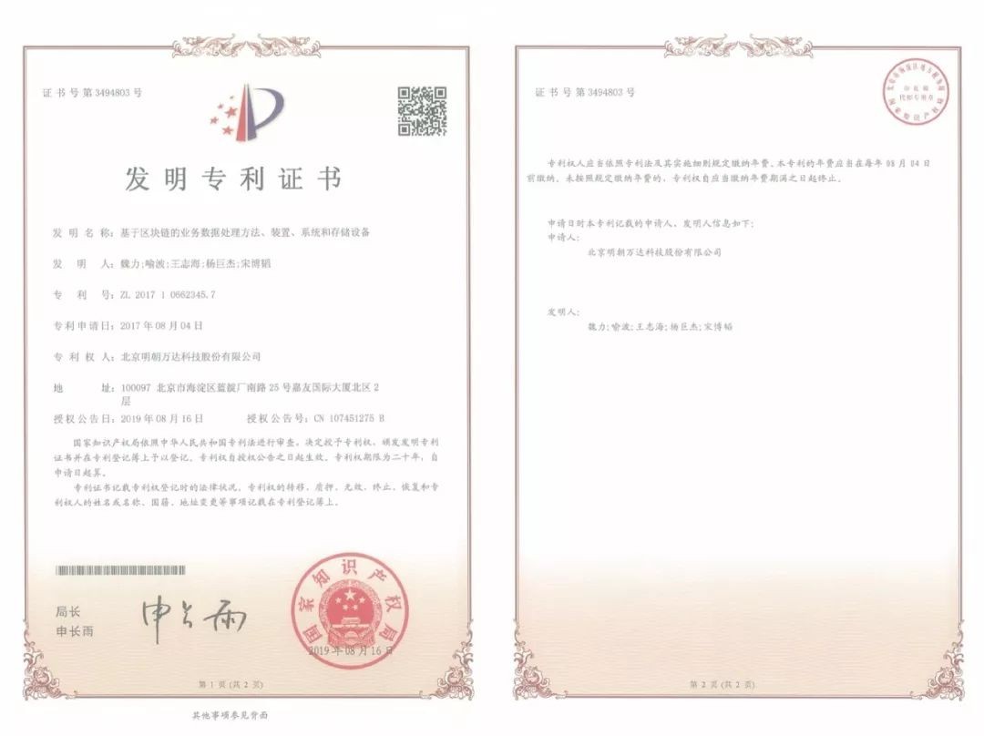 近日,明朝万达自主研发的“一种数据校验的方法和装置;基于区块链的业务数据处理方法、装置、系统和存储设备”两项创新技术顺利通过了国家知识产权局的严格审查,正式获得了由国家知识产权局颁发的发明专利证书。