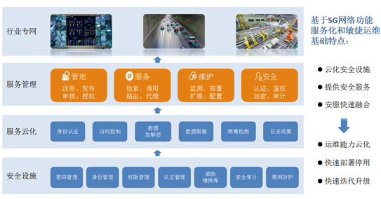 在5G行业专网安全能力服务化与敏捷运维方面,基于5G网络能力对外开放的基础特性,将安全能力云服务化,配合网络资源进行动态部署、快速迭代升级与分配组合,为行业用户提供灵活、高效、可定制的组合安全能力及运维能力。