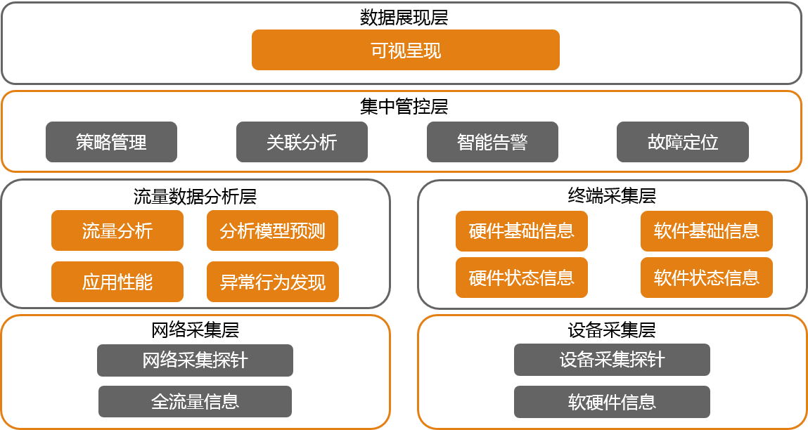 ⊙轻量化终端探针与网络探针实现用户、终端、网络、应用、数据的全流程采集。