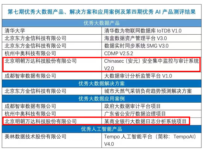 明朝万达凭借Chinasec(安元)安全集中监控与审计系统及某商业银行大数据日志分析系统项目,在大数据安全产品应用等方面的优异表现,获颁“优秀大数据产品认定证书”和“优秀大数据应用案例”双项认定。
