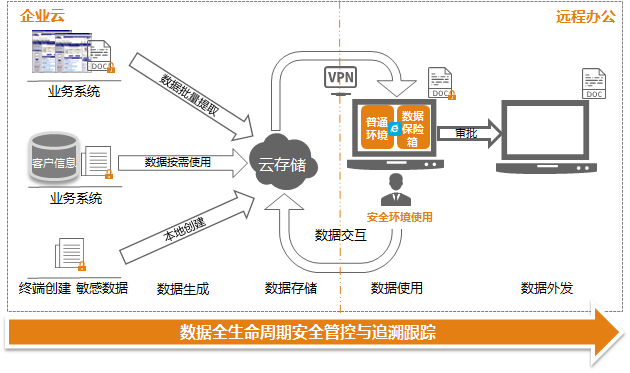 3) 远程隔离访问:仅限数据保险箱统一访问隔离区(云存储和本地安全保险箱),数据操作不落地;