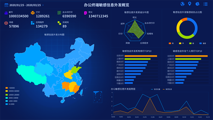 在敏感数据分布方面可以提供更加详细的敏感数据分布数据分析,提供敏感数据外发对比统计,同时支持地理位置钻取,支持敏感数据文件追溯;
