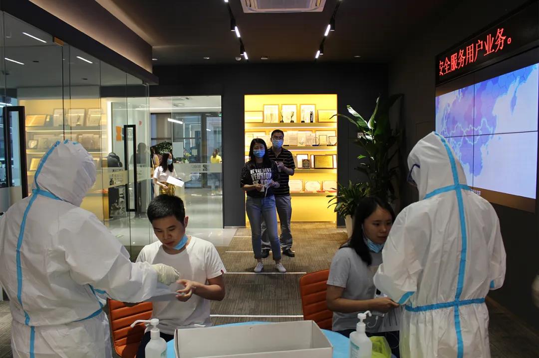 当天下午恰逢暴雨,核酸检测场地移至公司前台区域的空阔位置进行。