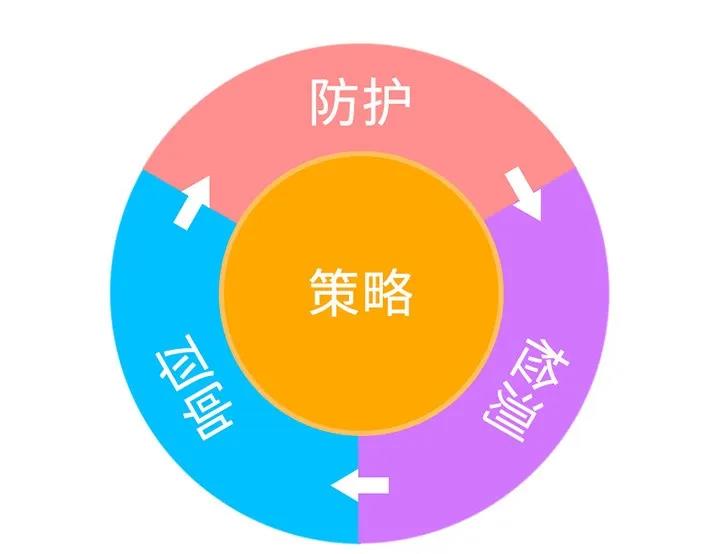 其中,策略是核心,描述系统哪些资源需要保护;防护是加密机制等技术;响应是应急策略;检测是入侵检测、数据防泄漏等技术。