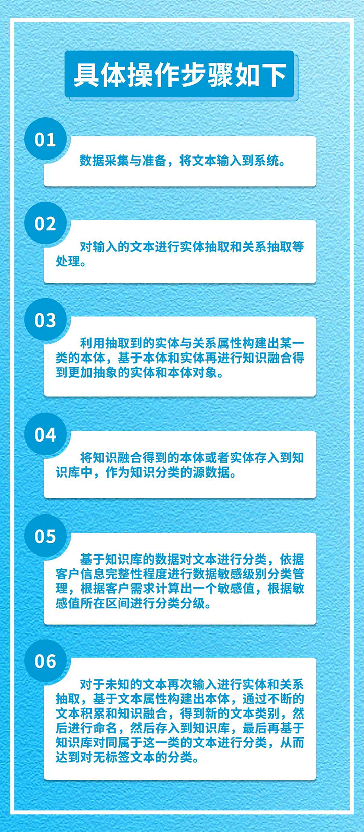 本实例基于已知标签文本的合同等类别和未知标签文本的数据进行分类来对知识图谱进行实施运用,大致分为数据输入,实体关系等属性抽取,知识融合和数据分类,然后对未知的文本进行正向反馈和自我学习,达到识别敏感数据分类分级的目的。