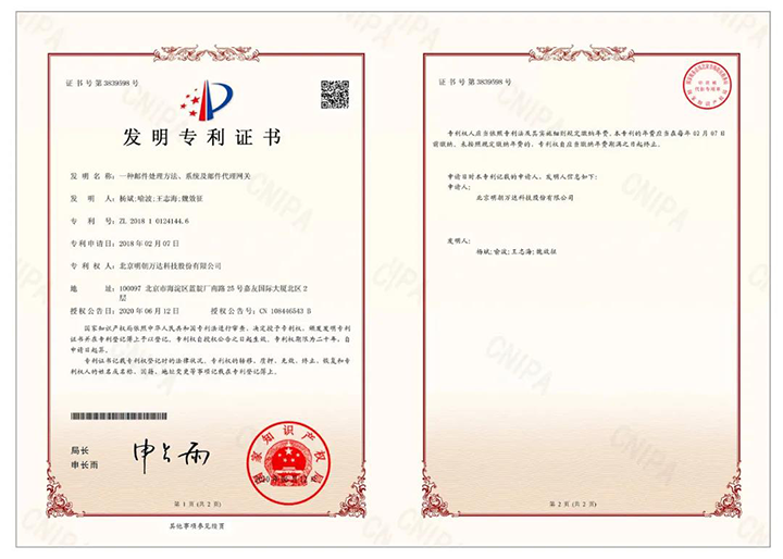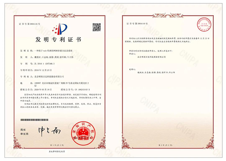 近期,明朝万达自主研发的“一种基于web代理的网闸穿透方法及系统”、“一种邮件处理方法、系统及邮件代理网关”两项创新技术顺利通过了国家知识产权局的严格审查,正式获得了由国家知识产权局颁发的发明专利证书。