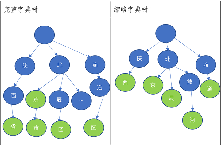 举例:在完整字典树中北辰区节点存储:天津,天津市,北辰区;在缩略字典树中西安节点存储:陕西省,西安市&吉林省,辽源市,西安区&黑龙江省,牡丹江市,西安区。