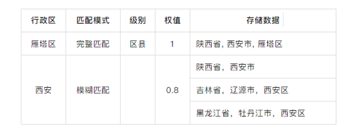 如果命中完整字典树某一个分支,设置阈值1.0, 读取保存的省市区县信息;