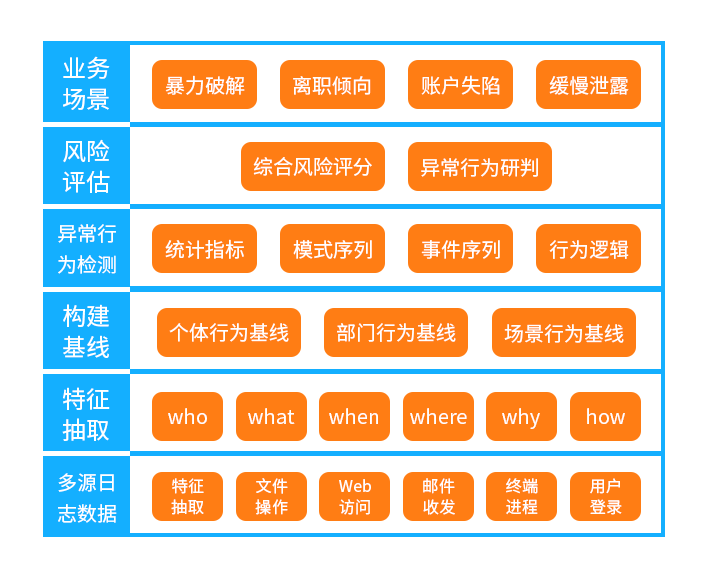 UEBA以大数据作为驱动,基于流量、文件操作、web访问和邮件收发等多源日志,结合5W1H模型(何人(Who)、 何事(What)、 何时(When)、 何地(Where)、何解(Why) 及如何(How))标准,从行为日志中抽取特征向量,构建正常用户、实体行为基线和用户画像,并基于机器学习、深度神经网络等算法实现异常行为检测,最后对异常行为进行研判,并对风险进行评估。2. 构建基线
