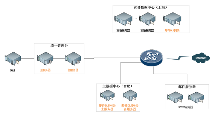通过邮件DLP管理平台对合肥的主数据中心和上海的灾备数据中心的邮件DLP网关进行统一管理,管理员可以对全行制定全局的安全策略,实现数据防泄漏系统的统一认证、统一管理和统一运维。