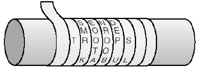公元前404年,斯巴达国(今希腊)北路军司令莱山得在征服雅典之后,本国的信使赶到,献上了一条皮带,上面有文字,通报了敌将断其归路的企图。莱山得当机立断,率师轻装脱离了险境。