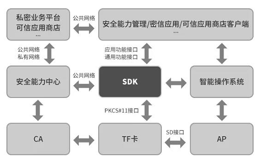 应用功能API接口接口将加密TF卡基础功能和与安全能力中心交互功能进行组合,为密信、可信应用商店提供所需的功能接口,可向所有安全应用开发者开放使用;