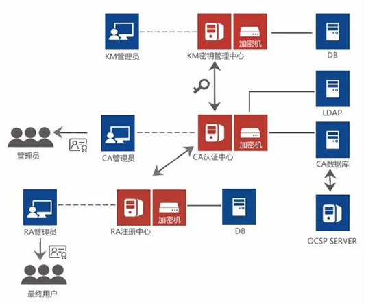 PKI在实际应用上是一套软硬件系统和安全策略的集合,它提供了一整套安全机制,使用户在不知道对方身份或者分布地很广的情况下,以证书为基础,通过一系列的信任关系取得安全通讯。一个完整的PKI体系由软硬件系统、证书机构CA、注册机构RA、证书发布系统、PKI策略以及PKI应用等组成。