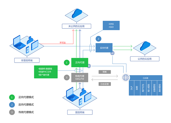CASB公有云传统代理模式可在公有云环境搭建相应的代理服务,满足企业在该使用场景下数据安全管控需求。