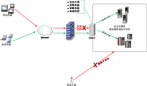 时常会遇到服务被非法入侵或数据被窥视的现象,使用CASB反向代理将服务真实地址隐藏,结合CASB内置安全模块,可有效保障企业的服务及数据的安全。