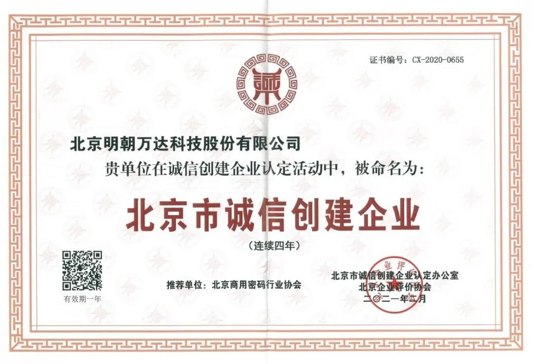连续四年获评“北京市诚信创建企业”称号,充分体现了政府、行业、协会对明朝万达诚信经营、守法经营良好形象的认可,也体现了业界对明朝万达十余年深耕数据安全领域所作努力的肯定。未来,明朝万达将继续保持优良作风,积极承担企业社会责任,为营造守法经营、诚实守信的社会氛围做出企业应有的贡献。