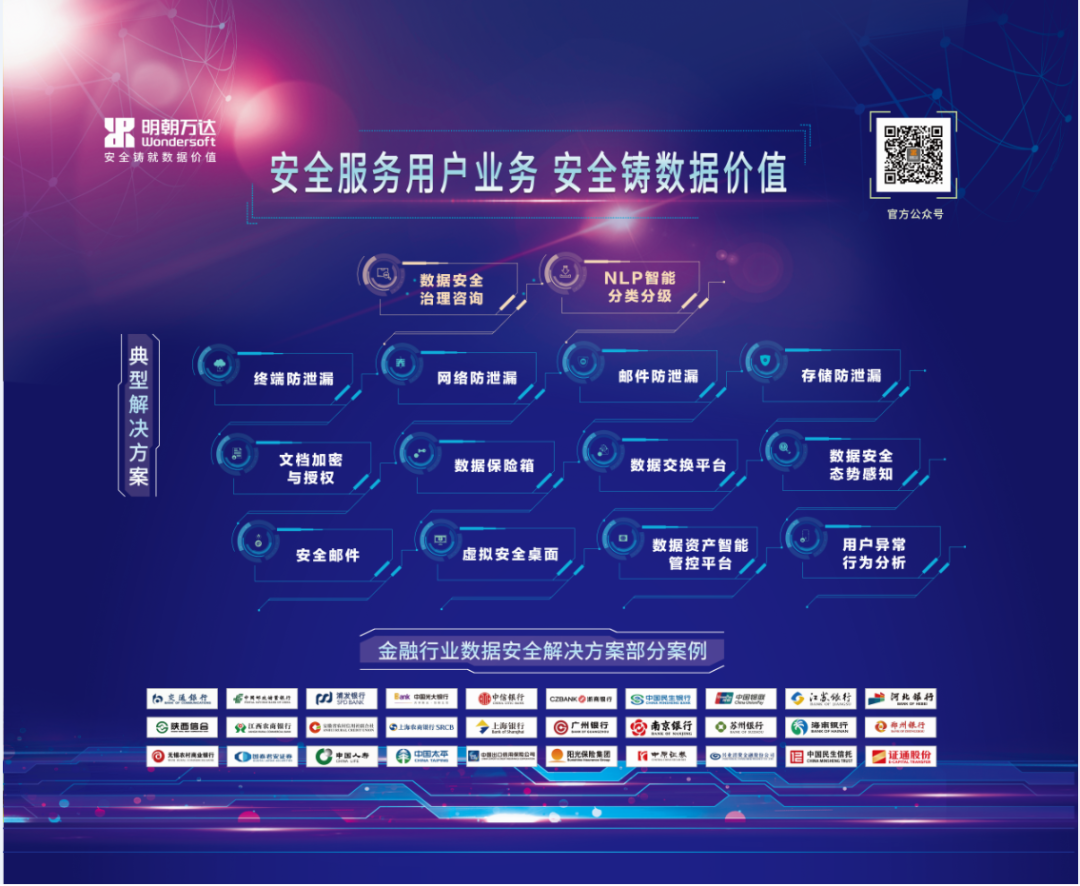 针对金融业在数据安全治理工作中面临的种种难题,明朝万达基于国家和行业相关法律法规与监管要求,凭借对金融行业数据安全领域多年项目实践经验,结合金融机构实际业务需求,提出了一套符合当前中国国情的数据安全治理体系。明朝万达提出建设一套自上而下的数据安全治理服务生态圈制度,主张政府行业主管部门、数据安全成熟度高的企业和组织,以及安全产业界、数字经济界、教育培训机构以及研究机构等规范的第三方数据安全服务产业共同发展,并发挥各自优势从而形成有效的配合,最终构成良性循环的数据安全模式,从而建立适应当今数字时代的协同治理模式,共同提升全社会的数据安全水平。明朝万达自2011年进入金融领域以来,经过多年努力,目前在金融领域的数据安全市场份额遥遥领先,并与包含中国银联、中国银行、交通银行、浦发银行、光大银行、中信银行、浙商银行、太平保险、国泰君安在内的近百家国有银行、股份制银行、城市商业银行等金融机构达成合作。