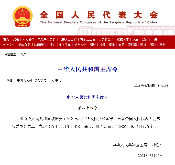 2021年6月10日,中华人民共和国主席令第84号发布,《中华人民共和国数据安全法》已由中华人民共和国第十三届全国人民代表大会常务委员会第二十九次会议于2021年6月10日正式表决通过,正式公布。