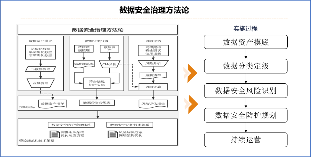 数据安全治理按照现行的法律法规和指引规范,过程一般包括五个阶段、二十多个步骤,若干个输出文档。特别是分类分级规则可与目标企业的数据防泄漏系统无缝对接,在数据防泄漏的扫描识别技术上实现结果应用。